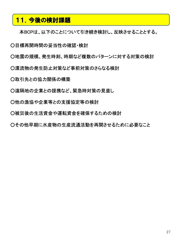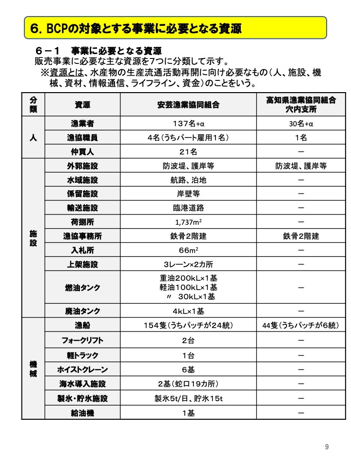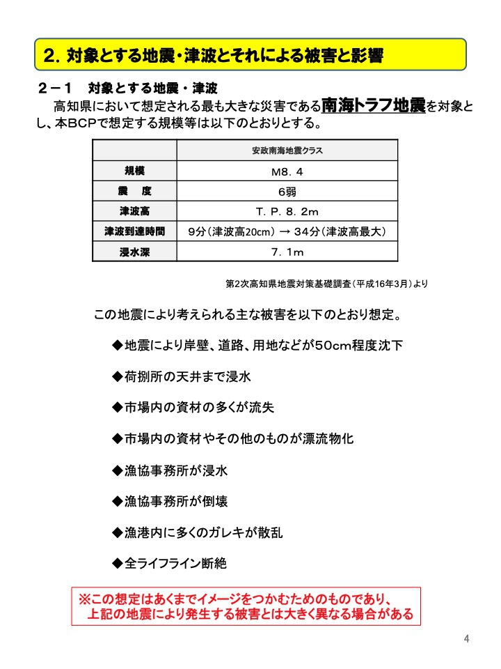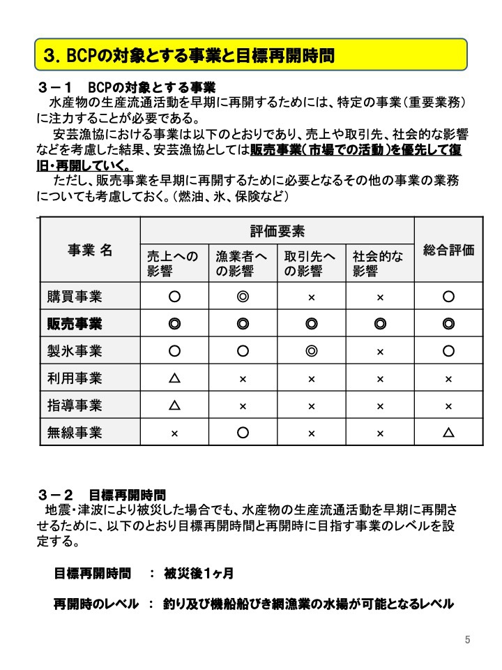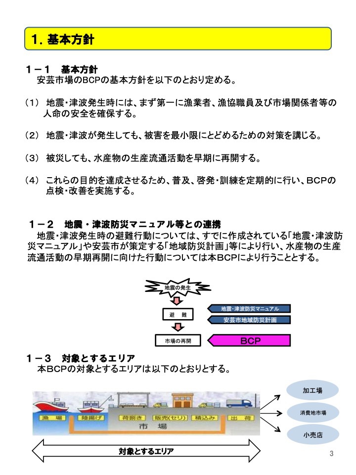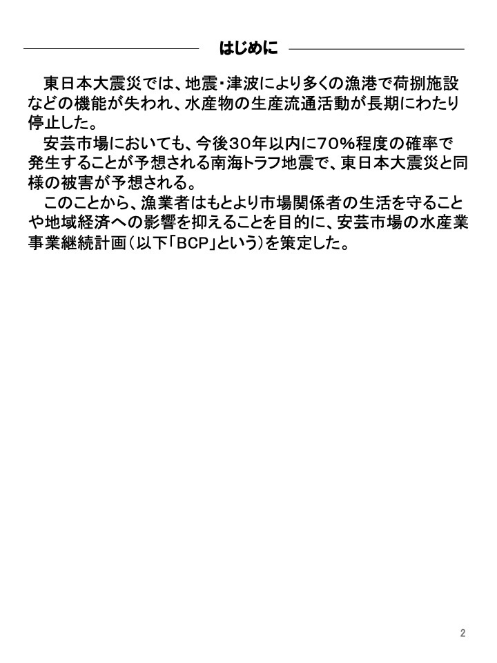 このことから、漁業者はもとより市場関係者の生活を守ることや地域経済への影響を抑えることを目的に、安芸市場の水産業事業継続計画(以下「BCP」という)を策定し た。